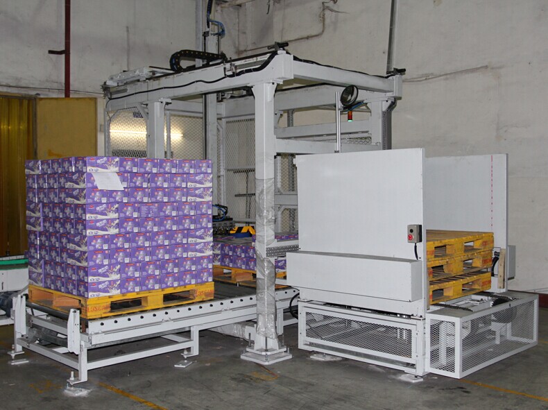 工作原理簡介:全自動單托碼垛機由一臺三軸碼垛機及一套(全自動雙托碼垛機為兩套)托板自動輸送系統(tǒng)構(gòu)成。其三軸伺服系統(tǒng)聯(lián)動,利用末端吸盤或夾爪從生產(chǎn)線上抓取箱體(袋)移載到托板相應(yīng)位置,垛型由程序設(shè)定。碼垛完成后,托盤自動輸送到下線端,同時空托盤被自動送入碼垛位置。