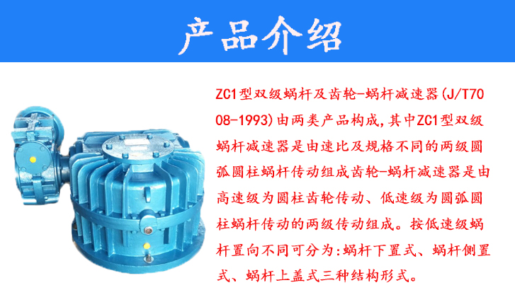 ZC1型雙級(jí)蝸桿及齒輪-蝸桿減速器(JB/T7008-1993)由兩類產(chǎn)品構(gòu)成,其中ZC1型雙級(jí)蝸桿減速器是由速比及規(guī)格不同的兩級(jí)圓弧圓柱蝸桿傳動(dòng)組成齒輪-蝸桿減速器是由高速級(jí)為圓柱齒輪傳動(dòng)、低速級(jí)為圓弧圓柱蝸桿傳動(dòng)的兩級(jí)傳動(dòng)組成。按低速級(jí)蝸桿置向不同可分為:蝸桿下置式、蝸桿側(cè)置式、蝸桿上式三種結(jié)構(gòu)形式!霎a(chǎn)品特點(diǎn)該系列減速機(jī)具有承載能力高、傳動(dòng)效率高、傳動(dòng)比大、結(jié)構(gòu)緊湊等特點(diǎn),主要適用于冶金、礦山、起重、運(yùn)輸、化工建筑、建材、建筑、輕工等行業(yè)。