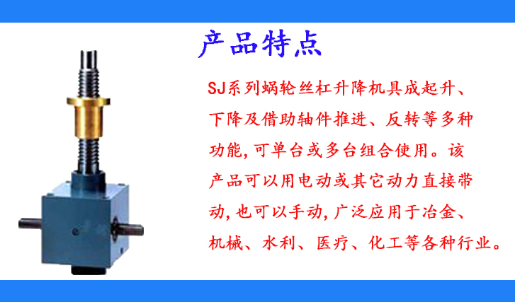 SJ系列蝸輪絲杠升降機具成起升、下降及借助軸件推進、反轉等多種功能,可單臺或多臺組合使用。該產(chǎn)品可以用電動或其它動力直接帶動,也可以手動,廣泛應用于冶金、機械、水利、醫(yī)療、化工等各種行業(yè)。