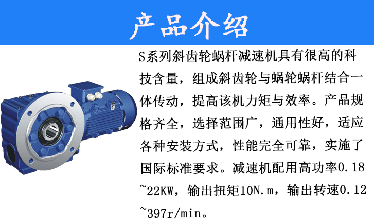 S系列齒輪蝸桿減速電機具有很高的科技含量,有斜齒輪與蝸輪蝸桿結(jié)合一體傳動,提高該機力矩與效率。該系列產(chǎn)品規(guī)格齊全,轉(zhuǎn)速范圍廣,通用性好,適應(yīng)各種安裝方式,性能安全可靠壽命長,實施了國際標(biāo)準(zhǔn)要求。減速機配用高功率0.18~22KW,輸出轉(zhuǎn)距10N.m~4890N.m,輸出轉(zhuǎn)速.12~397r/mino