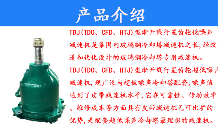 TDU(TDO、CFD、HTJ)型漸開(kāi)線行星齒輪低噪聲減速機(jī)是集國(guó)內(nèi)玻璃鋼冷卻塔減速機(jī)之長(zhǎng),經(jīng)改進(jìn)和優(yōu)化設(shè)計(jì)的玻璃鋼冷卻塔專用減速機(jī)。TD(TDO、CFD、HTJ型漸開(kāi)線行星齒輪超低噪聲減速機(jī),現(xiàn)廣泛與超低噪聲冷卻塔配套,噪聲值達(dá)到了皮帶減速機(jī)水平,它在可靠性、傳動(dòng)效率、維修成本等方面具有皮帶減速機(jī)無(wú)可比擴(kuò)的優(yōu)勢(shì),是配套超低噪聲冷卻塔最理想的減速機(jī)。
