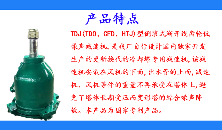 TDJ(TDO、CFD、HTJ)型倒裝式漸開(kāi)線齒輪低噪聲減速機(jī),是我廠自行設(shè)計(jì)國(guó)內(nèi)獨(dú)家開(kāi)發(fā)生產(chǎn)的更新?lián)Q代的冷卻塔專用減速機(jī),該減速機(jī)安裝在風(fēng)機(jī)的下面,出水管的上面,減速機(jī)、風(fēng)機(jī)等件的重量不再承受在塔體上,避免了塔體長(zhǎng)期受壓而變形塔的綜合噪聲降低。本產(chǎn)品為國(guó)家專利產(chǎn)品。