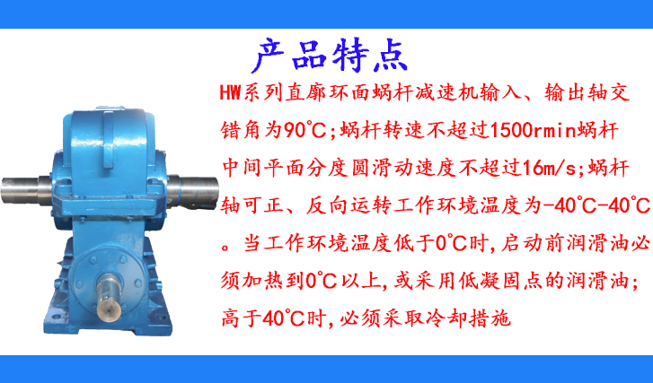 HW系列直廓環(huán)面蝸桿減速機輸入、輸出軸交錯角為90℃;蝸桿轉(zhuǎn)速不超過1500rmin蝸桿中間平面分度圓滑動速度不超過16m/s;蝸桿軸可正、反向運轉(zhuǎn)工作環(huán)境溫度為-40℃-40℃。當(dāng)工作環(huán)境溫度低于0℃時,啟動前潤滑油必須加熱到0℃以上,或采用低凝固點的潤滑油;高于40℃時,必須采取冷卻措施