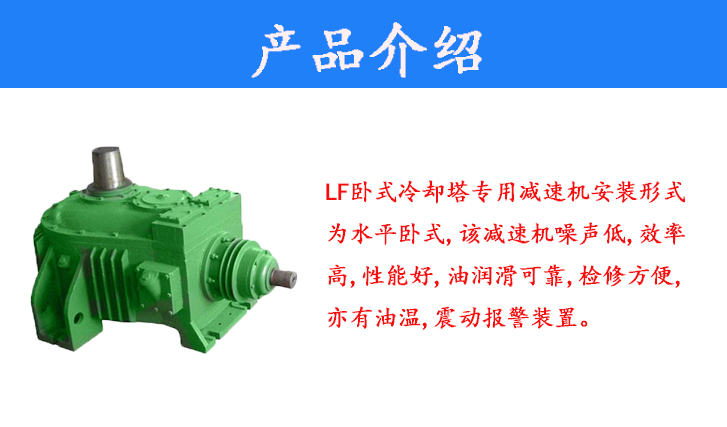 LF臥式冷卻塔專用減速機安裝形式為水平臥式,該減速機噪聲低,效率高,性能好,油潤滑可靠,檢修方便,亦有油溫,震動報警裝置。