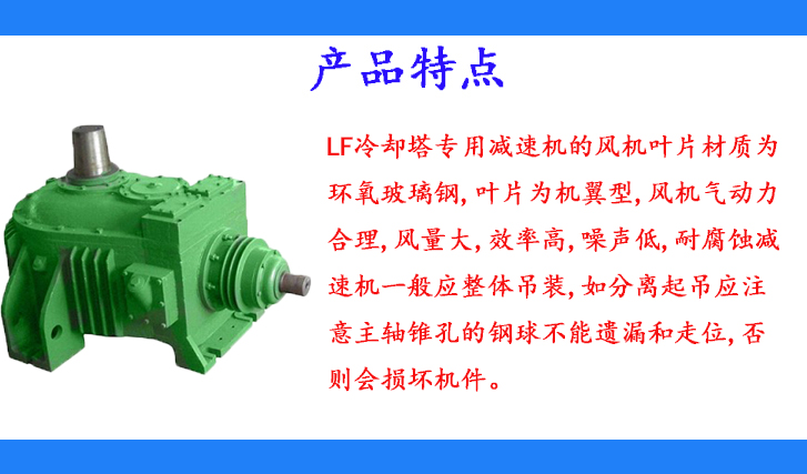 LF冷卻塔專用減速機的風機葉片材質為環(huán)氧玻璃鋼,葉片為機翼型,風機氣動力合理,風量大,效率高,噪聲低,耐腐蝕減速機一般應整體吊裝,如分離起吊應注意主軸錐孔的鋼球不能遺漏和走位,否則會損壞機件。