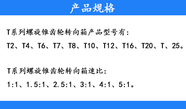 T系列螺旋錐齒輪轉(zhuǎn)向箱產(chǎn)品型號:T2、T4、T6、T7、T8、T10、T12、T16、T20、T25