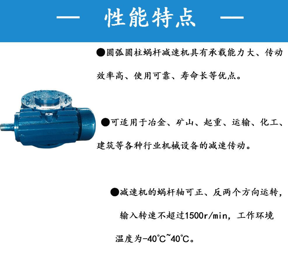 圓弧圓柱蝸桿減速機(jī)具有承載能力大、傳動(dòng)效率高、使用可靠、壽命長(zhǎng)等優(yōu)點(diǎn),可適用于冶金、礦山、起重、運(yùn)輸、化工、建筑等各種行業(yè)機(jī)械設(shè)備的減速傳動(dòng)。減速機(jī)的蝸桿軸可正、反兩個(gè)方向運(yùn)轉(zhuǎn),輸入轉(zhuǎn)速不超過(guò)1500r/min,工作環(huán)境溫度為-40℃-40℃。