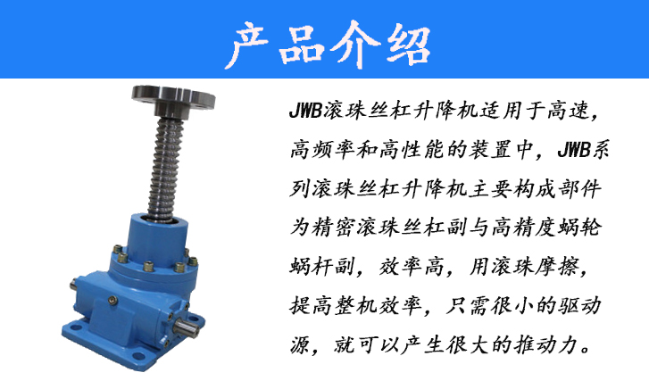 JWB滾珠絲杠升降機(jī)適用于高速、高頻率和高性能的裝置中,JWB系列滾珠絲杠升降機(jī)主要構(gòu)成部件為精密滾珠絲杠副與高精度度蝸輪蝸桿副,效率高,用滾珠摩擦,提高整機(jī)效率,只需很小的驅(qū)動源,就可以產(chǎn)生很大的推動力。