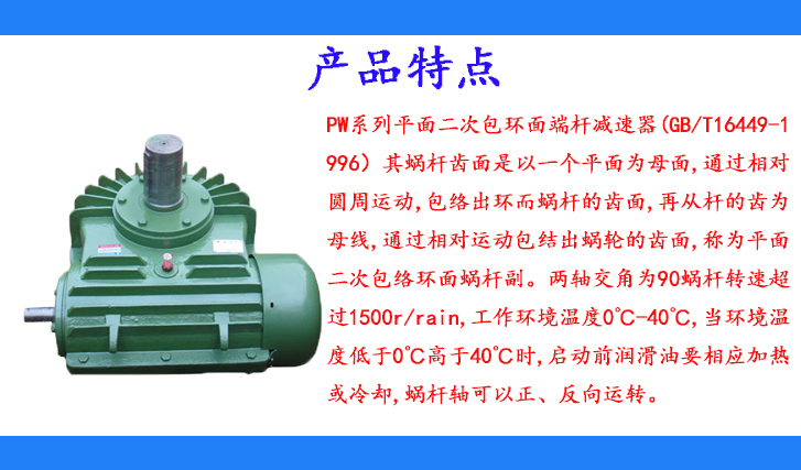 PW系列平面二次包環(huán)面端桿減速器(GB/T16449-1996)其蝸桿齒面是以一個(gè)平面為母面,通過相對(duì)圓周運(yùn)動(dòng),包絡(luò)出環(huán)而蝸桿的齒面,再從桿的齒為母線,通過相對(duì)運(yùn)動(dòng)包結(jié)出蝸輪的齒面,稱為平面二次包絡(luò)環(huán)面蝸桿副。兩軸交角為90蝸桿轉(zhuǎn)速超過1500r/rain,工作環(huán)境溫度0℃-40℃,當(dāng)環(huán)境溫度低于0℃高于40℃時(shí),啟動(dòng)前潤(rùn)滑油要相應(yīng)加熱或冷卻,蝸桿軸可以正、反向運(yùn)轉(zhuǎn)。