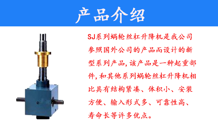 SJ系列蝸輪絲杠升降機(jī)是我公司參照國外公司的產(chǎn)品而設(shè)計(jì)的新型系列產(chǎn)品,該產(chǎn)品是一種起重部件,和其他系列蝸輪絲杠升降機(jī)相比具有結(jié)構(gòu)緊湊、體積小、安裝方便、輸入形式多、可靠性高、壽命長等許多優(yōu)點(diǎn)。