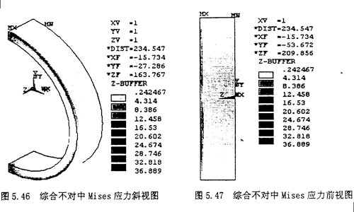 2.顯示節(jié)點(diǎn)的Von Mises應(yīng)力云圖:選擇Main Menu>General Postproc>Plot Result>NodalSolu,在彈出的對(duì)話框內(nèi)選擇“Stress”,第二欄內(nèi)選擇“Von Mises Stress”,則其顯示的云圖如圖5.46,5.47所示