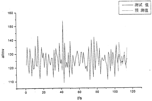 本節(jié)對(duì)在某車(chē)床上采集的振動(dòng)信號(hào)用AR(M)模型進(jìn)行預(yù)測(cè),表6-8為測(cè)試數(shù)據(jù)值,預(yù)測(cè)結(jié)果見(jiàn)圖6-5(圖中,a-振動(dòng)加速度,t-時(shí)間),與實(shí)測(cè)結(jié)果相比,AR(M)模型預(yù)測(cè)誤差最大點(diǎn)為6.22%,最小點(diǎn)為0.34%,基本符合預(yù)測(cè)要求。