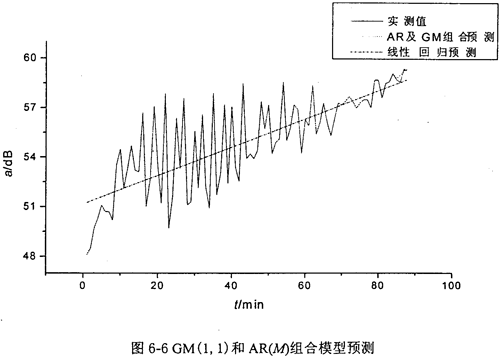 表6-9是在某軸承座上測(cè)得的振動(dòng)加速度信號(hào),經(jīng)檢驗(yàn)該時(shí)間序列為一個(gè)非平穩(wěn)序列,現(xiàn)用GM(1,1)和AR(M)組合模型預(yù)測(cè)第85至第88個(gè)數(shù)據(jù)點(diǎn),預(yù)測(cè)結(jié)果見(jiàn)圖6-6。預(yù)測(cè)誤差最大點(diǎn)為1.7%,最小點(diǎn)為0.33%。圖6-6中還畫(huà)出了有線(xiàn)性回歸模型預(yù)報(bào)的結(jié)果,預(yù)報(bào)誤差最大達(dá)2.23%。