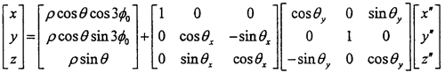 由于動坐標系O″X″Y″Z″的O″Y″軸取得始終垂直于固定坐標系OX軸,可認為先把OXYZ坐標系繞OX軸轉過夾角θx,使OY軸與O″Y″軸平行,再繞新的OY軸轉過θy,使OX軸與O″X″軸平行,OZ軸也同時平行于O″Z″軸(變換空間位置如圖3-6所示)。則固定坐標OXYZ與動坐標系間的變換關系如下: