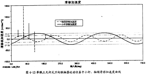 由圖4-13可以知道,在一定的夾角下,小桿在滑道中有滑移加速度同小桿球面中心相對(duì)軸頸的滑移加速度是不同的,前者要大于后者,且它們變動(dòng)的頻率也不一樣,在一個(gè)回轉(zhuǎn)周期中,前頻率是1次,而后者2次。此圖中的兩曲線同第三章中的理論分析曲線圖3-13、圖3-14是吻合的,只是小桿滑移的加速度曲線在外形上有差異,仿真的曲線相當(dāng)?shù)钠交⒁?guī)則,但理論分析曲線卻不規(guī)則,這可能是在計(jì)算中簡(jiǎn)化和省略的原因。盡管如下,這在一定的程度上也證明了三叉桿式萬(wàn)向聯(lián)軸器理論分析中對(duì)小桿滑移加速度和軸頸滑移加速度這兩項(xiàng)計(jì)算的正確性。(值得說(shuō)明的是此圖中曲線有時(shí)有突變的現(xiàn)象,主要是考慮到計(jì)算機(jī)的性能,計(jì)算中步長(zhǎng)稍大的原故。在后面的分析曲線中也出現(xiàn)了這樣的情況,將不再作說(shuō)明。)