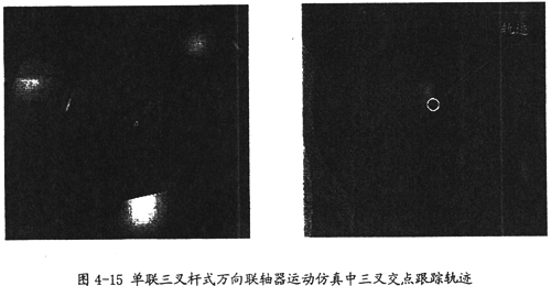 由圖4-15可以看出,在單聯(lián)三叉桿式萬(wàn)向聯(lián)軸器的運(yùn)動(dòng)仿真中,三叉交點(diǎn)運(yùn)動(dòng)軌跡是一個(gè)圓,相對(duì)于半徑值R(此值的意義見(jiàn)第三章)它的半徑是相當(dāng)小的,這也解釋了為何運(yùn)動(dòng)中兩軸夾角在不斷作微小的變化,同時(shí)也證明了軸頭中心軌跡理論的正確性。