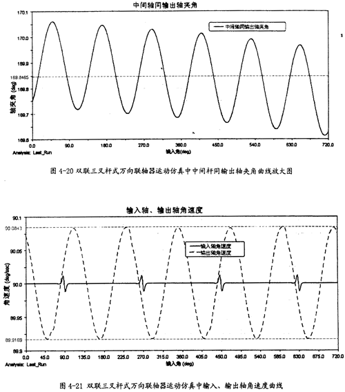 由圖4-20可以看出,中間桿同輸出軸間的夾角變化也呈現(xiàn)一定的規(guī)律,在每-個(gè)回轉(zhuǎn)周期中,它的變化頻率為3次。結(jié)合圖4-19、圖4-20可知中間桿同輸入軸及輸出軸夾角的變化頻率是不-樣的,這是雙聯(lián)三叉桿式萬向聯(lián)軸器有別于單聯(lián)三叉桿式萬向聯(lián)軸器的一種特性。