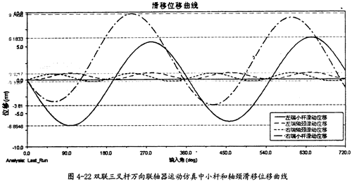 由圖4-22可以看出,雙聯(lián)三叉桿式萬向聯(lián)軸器在運(yùn)轉(zhuǎn)的過程中,左右兩端的小桿滑移位移量幾乎相等,左右兩端軸頸的滑移位移量也接近等值,且軸頸的滑移位移量比小桿沿滑道滑動(dòng)的位移量要小得多,這同單聯(lián)三叉桿式萬向聯(lián)軸器的特性是相同的。