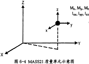 此單元為一個有六自由度的質(zhì)量單元。此單元的第一個不同的坐標方向上可以施加不同的質(zhì)量大小和轉(zhuǎn)動慣量。質(zhì)量單元是由單個節(jié)點、單元坐標方向的集中質(zhì)量系數(shù)、單元坐標軸的旋轉(zhuǎn)慣性所決定的。為了在加入質(zhì)量單元后不影響系統(tǒng)的慣性屬性,在此單元的實常數(shù)設定中慣性量應設定的非常。ㄈ缧∮10-4)。單元如圖6-4所示。
