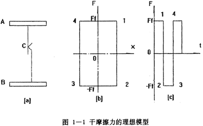 雙線性模型是非線性遲滯系統(tǒng)模型中最簡單的一種,而且也是最為久遠(yuǎn)的模型,對于它的初始機(jī)理研究最早可追溯到三十年代的Deo Hartog,他在研究干摩擦?xí)r提出了干磨擦的理想模型,他認(rèn)為在一個具有干摩擦面的單自由度系統(tǒng)中,干摩擦力隨相對滑移位移的關(guān)系可用一矩形來表示,如圖1-1所示。當(dāng)該系統(tǒng)受到外力激勵發(fā)生運動時,干摩擦力總是與運動速度反向而且阻礙運動,進(jìn)而耗損系統(tǒng)的能量,從時域的角度看,干摩擦力的波形為矩形波,Den Hartog還按能量耗散相等原理,把理想干摩擦等效成粘性阻尼。實際上干摩擦交界面,在外力小于摩擦力時,兩邊就有變形,隨著外力的增加,此變形隨之增大,這是因為交界面兩邊的物質(zhì)有一定的彈性。即使兩邊有較大的滑移時,交界面上的干摩擦力仍然不是常數(shù),而是隨振幅的增大而緩慢上升的。Earlestes等人對此作了描述,認(rèn)為一旦交界面有了滑移,干摩擦的線性力不是常數(shù)(4Ffπ),而是與相對位移X有關(guān),從Ff變到4Ff/π,表達(dá)式為