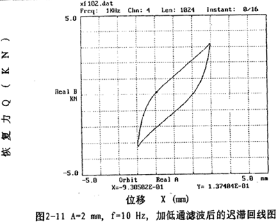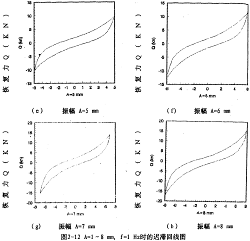 圖2-9(見26頁)表示激振頻率為1OHz,振動(dòng)位移幅值為±2毫米的位移和恢復(fù)力時(shí)間歷程圖,圖2-10(見26頁)、圖2-11(見27頁)為對應(yīng)的遲滯回線圖。圖2-l2(見27、28頁)表示激振頻率為IHz,振動(dòng)位移幅值分別為±(1-8)毫米的位移一恢復(fù)力圖,圖2-14(見29頁)則為圖2-12的合圖,由圖2-14同頻率不同振幅的八條遲滯回線分析可知,大撓度剛絲繩彈性聯(lián)軸器的動(dòng)剛度與振動(dòng)幅值有關(guān),同時(shí),從遲滯回線面積(表示聯(lián)軸器阻尼所耗散的能量)可知聯(lián)軸器的阻尼與振動(dòng)幅值也有關(guān),即聯(lián)軸器的動(dòng)剛度和阻尼均是振幅的非線性函數(shù)。