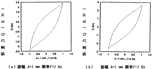 圖2-13(見28、29頁)表示振幅為l毫米,激振頻率分別為2,3,4,6,8,10Hz的遲滯回線圖,圖2-15(見29頁)表示振幅為1毫米,激振頻率為1,2,3,4,6,8,10,20,30Hz的遲滯回線合圖。由圖2-15可知,彈性聯(lián)軸器的動(dòng)剛度與振動(dòng)頻率有關(guān),即隨著頻率增大,對應(yīng)的遲滯回線的恢復(fù)力與位移的比值變小,當(dāng)頻率在8Hz至30Hz范圍內(nèi)時(shí),遲滯回線基本重合,由此可知鋼絲繩聯(lián)軸器動(dòng)剛度在一定頻率范圍內(nèi)與頻率有關(guān)、當(dāng)頻率增大到8Hz以后,聯(lián)軸器的動(dòng)剛度不再隨頻率變化而變化,因而聯(lián)軸器的動(dòng)剛度在一定頻率范圍內(nèi)與頻率有關(guān),當(dāng)頻率增大到8Hz以后,聯(lián)軸器的動(dòng)剛度不再隨頻率變化而變化,因而聯(lián)軸器的動(dòng)剛度在一定頻率范圍內(nèi)是頻率的非線性函數(shù),當(dāng)頻率增大到一定值后,動(dòng)剛度與頻率無關(guān),同樣,聯(lián)軸器的阻尼在一定頻率范圍內(nèi)的頻率的非線性函數(shù),當(dāng)頻率增大到一定值后(這里是8Hz),阻尼與頻率無關(guān)。