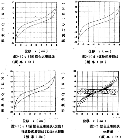 為了說明5階和7階冪函數(shù)多項式擬合的精度情況,以振幅A=8毫米,頻率為1赫茲為例,畫出擬合回線分別如圖3-1(b)、3-1(c)所示,將它們與對應試驗回線圖3-1(d)比較,可知7階擬合精度高于5階。圖3-1(e)為圖3-1(b)與圖3-1(d)的合圖。