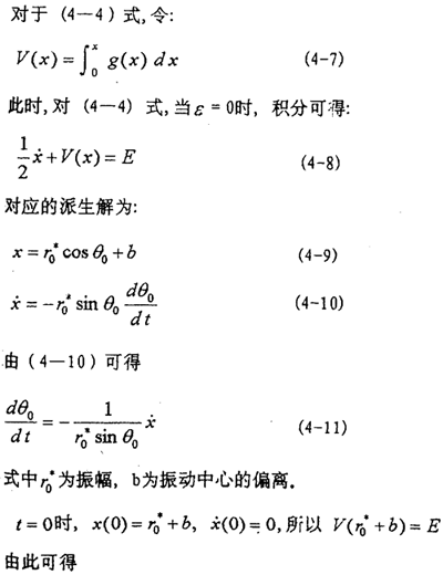 目前文獻(xiàn)上的一些方法對(duì)于弱非線性系統(tǒng)是有效的,而對(duì)于(4-2)式的強(qiáng)非線性系統(tǒng)則遇到了麻煩。由于描述非線性振動(dòng)系統(tǒng)的微分方程種類繁多,沒(méi)有普遍的解法,因此,仍然只有極少非線性振動(dòng)方程可求得精確解。可行的辦法是針對(duì)不同非線性振動(dòng)方程的特點(diǎn)尋求一些近似數(shù)值解法。為研究方便,將(4-2)式進(jìn)一步寫(xiě)成以下形式: