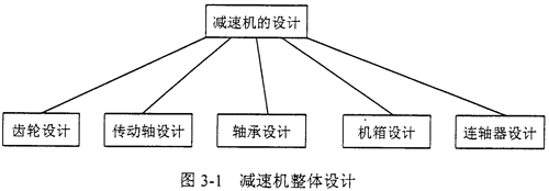 減速機(jī),作為一個(gè)完整的傳動(dòng)系統(tǒng),其設(shè)計(jì)包括:齒輪設(shè)計(jì),傳動(dòng)軸設(shè)計(jì),軸承設(shè)計(jì),機(jī)箱設(shè)計(jì)以及連軸器設(shè)計(jì),如圖3-1所示。