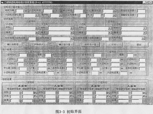 在這三類(lèi)參數(shù)中,用戶參數(shù)是要由用戶給定,齒輪特性參數(shù)是要得到的結(jié)果,齒輪設(shè)計(jì)參數(shù)是一種中間描述參數(shù),它需要通過(guò)一系列的復(fù)雜的計(jì)算求解,而齒輪設(shè)計(jì)的科學(xué)性也就是通過(guò)對(duì)齒輪設(shè)計(jì)參數(shù)的精確確定而實(shí)現(xiàn)的,具體計(jì)算機(jī)實(shí)現(xiàn)公式見(jiàn)3.6-3.8;齒輪的接觸強(qiáng)度與彎曲強(qiáng)度校核分別見(jiàn)3.3和3.4。系統(tǒng)的參數(shù)初始輸入界面見(jiàn)圖3-3。