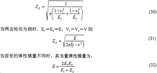 彈性系數(shù)ZE是用以考慮霉爛彈性模量E和泊桑比v對赫茲應(yīng)力的影響。其數(shù)值可按實際材料彈性模量E和泊桑比v由式(30)計算得出。