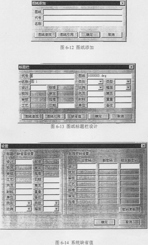根據(jù)相應(yīng)項(xiàng)的密碼輸入,再選擇/添加/刪除產(chǎn)品,見(jiàn)圖6-10,進(jìn)行圖紙管理系統(tǒng)的主畫面(見(jiàn)圖6-11),進(jìn)而對(duì)產(chǎn)品選擇、圖紙進(jìn)行添加、刪除(圖6-12)及其編輯,明細(xì)表、標(biāo)題欄的設(shè)計(jì)(圖6-13)以及一些系統(tǒng)缺省值(圖6-14)的固定等等;