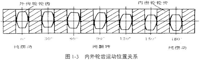 鼓形齒聯軸器的運動是復雜的空間運動,現有資料均把它簡化為展開的平面運動來進行分析,在有軸間傾角的狀態(tài)下,將運動分為齒的擺動運動和翻轉運動。這兩種運動在嚙合過程的半周中經歷純擺動—復合運動—純翻轉—復合運動—純擺動的循環(huán)運動過程,如圖1-3所示。純擺—純翻轉的相位差為90°。在非純擺動和純翻轉運動過程中,內外齒的相對運動是擺動運動和翻轉運動的復合運動。顯然這種簡化分析方法是很粗略的,無法確切地描述它們的空間嚙合狀態(tài),但是它對于分析齒向位移、棱邊卡死現象及說明某一輪齒所處周向位置是有意義的。
