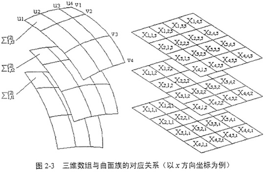 若已知曲面Σ1由一系列離散的坐標值表示,則規(guī)則化后的坐標值系列可以寫成二維數(shù)組成的形式,二維數(shù)組中的各維分別對應(yīng)u,v參變量或方向,二維數(shù)組中的各元素分別對應(yīng)曲面上節(jié)點的坐標;那么,曲面Σ1在坐標S2中運動形成的曲面族{Σ1}可以用三維數(shù)組表示,三維數(shù)組的各維分別對應(yīng)u,v,t參變量或方向,并且曲面族中的各點與此三維數(shù)組的各個元素在空間結(jié)構(gòu)上是——對應(yīng)的,如圖2-3所示。