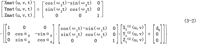 設已知接觸線為C1,它可以由三個一維數(shù)組Xc1,Yc1,Zc1表示,螺旋運動的角速度為ω,軸向移動速度為v,則由它生成的螺旋面可以用如下的坐標變換表示為: