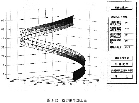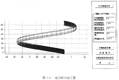 借助于軟件Conjugater1.0求銑刀加工的過程與求解軋輥曲面的過程相同。輸入輸出界面和結(jié)果如圖3-10、圖3-11、圖3-12、圖3-13所示。最后得到如圖的兩個螺旋面,這兩個螺旋面都是滿足共軛條件的,圖3-12表示銑刀在工件實體的外圓加工所得的曲面,圖3-13表示銑刀在工件的內(nèi)壁加工所得的曲面。應用時可根據(jù)實際情況選取。