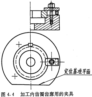 內(nèi)齒圈齒廓的數(shù)控加工,是在齒圈外徑及兩端面都精加工后進(jìn)行的,因此,應(yīng)以端面及外徑作為定位基準(zhǔn)。其夾具可做成螺釘壓板結(jié)構(gòu),如圖4.4所示。夾具內(nèi)徑應(yīng)盡量接近齒圈外徑,用千分表以?shī)A具內(nèi)圓為基準(zhǔn)找正工作臺(tái)軸心。