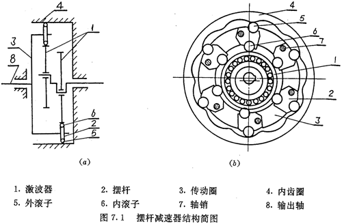 圖7.1所示為擺桿減速器的結(jié)構(gòu)簡圖。擺桿減速器也由四大部分組成:激波器1;擺動機(jī)構(gòu)(包括擺桿2,內(nèi)滾子6, 外滾子5和軸銷7);傳動圈3 以及與其固聯(lián)的輸出軸8;內(nèi)齒圈4?梢钥闯觯藬[動機(jī)構(gòu)外,其它構(gòu)成與推桿減速器類似。也采用了兩套完全相同且互成180°的激波器及內(nèi)齒圈以實(shí)現(xiàn)輸出的靜平衡和提高嚙合效率。