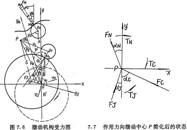 力FJ對于擺動機(jī)構(gòu)的擺動中心P點(diǎn)的扭矩TJ是逆時針方向,數(shù)值為:
