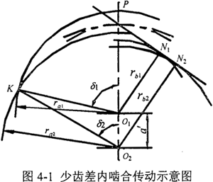 少斷差內(nèi)嚙合傳動是指內(nèi)、外齒輪的齒數(shù)差較少的一種行星傳動形式,它具有傳動比大、體積小、重量輕、加工方便等優(yōu)點,日益廣泛地應(yīng)用于國防、礦山、冶金、化工、紡織、起重運(yùn)輸、建筑工程、食品工業(yè)和儀表制造等部門和行業(yè)中。少齒差內(nèi)嚙合傳動示意圖如圖4-1所示。