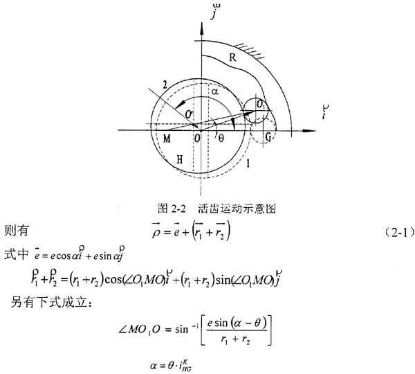 (圖2-2) ,波發(fā)生器H勻速逆時針旋轉(zhuǎn),設(shè)活齒在波發(fā)生器上作純滾動并在中心輪齒廓限制下推動活齒架作勻速逆時針轉(zhuǎn)動。波發(fā)生器H 的幾何中心為O′,活齒G 的幾何中心為O1。在矢量ΔO O′O1中,矢量