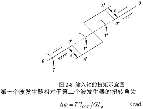 在實際應(yīng)用中,為平衡掉負(fù)載對支承的徑向作用,一般采用180°對稱布置的雙排結(jié)構(gòu),兩排活齒共用一個活齒架。圖2-8 中O′a′、O″A″分別表示第一排、第二排波發(fā)生器的偏心距。在以下分析中約定:上角標(biāo)“′”表示第一排活齒傳動的參數(shù),上角標(biāo)“″”表示第二排活齒傳動的參數(shù)。T1、T1′和T1″分別表示輸入軸上的總輸入力矩、第一和第二個波發(fā)生器分擔(dān)的輸入力矩。在輸入力矩的作用下,輸入軸和波發(fā)生器發(fā)生扭轉(zhuǎn)變形使兩波發(fā)生器的相位差由理論的180°有了一個相對的變化△φ,從而使兩排活齒的受力情況略有不同,所承擔(dān)的扭矩也不同。為此,引入載荷傳遞不均勻系數(shù)Kp,設(shè)第二排活齒傳遞的扭矩為KpT2,則第一排活齒傳遞扭矩為(l-KP)T2,其中T2為輸出軸上輸出的總扭矩。