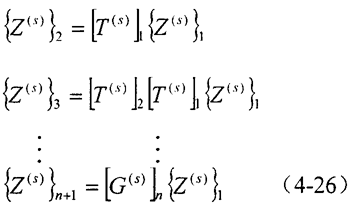 當(dāng)不計(jì)阻尼時,慣性元件的傳遞矩陣是系統(tǒng)振動頻率的平方ω2的函數(shù),彈性元件的傳遞矩陣僅與元件的剛度有關(guān),所以系統(tǒng)累積傳遞矩陣的元素G22是ω2的函數(shù),并且ω2的階次與系統(tǒng)的慣性元件數(shù)目相同,所以滿足式(4-25)的振動頻率均為系統(tǒng)的固有頻率。