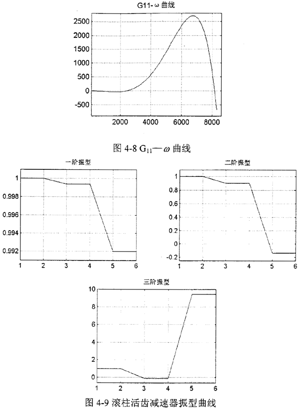 根據(jù)前面介紹的方法,在計(jì)算機(jī)上編程對減速器的扭振動力學(xué)特性進(jìn)行分析,其程序框圖見圖4-7所示。在計(jì)算機(jī)上運(yùn)算時,按照確定的頻率步長對頻率方程掃頻,作出“G11-ω”曲線,如圖4-8所示,凡G22=0時的ω值,就是系統(tǒng)的固有頻率。有關(guān)固有頻率、勢能分布率和模態(tài)柔度的計(jì)算結(jié)果見表4-2。另外,利用該程序還繪制出圖4-9所示的減速器系統(tǒng)的振型曲線。