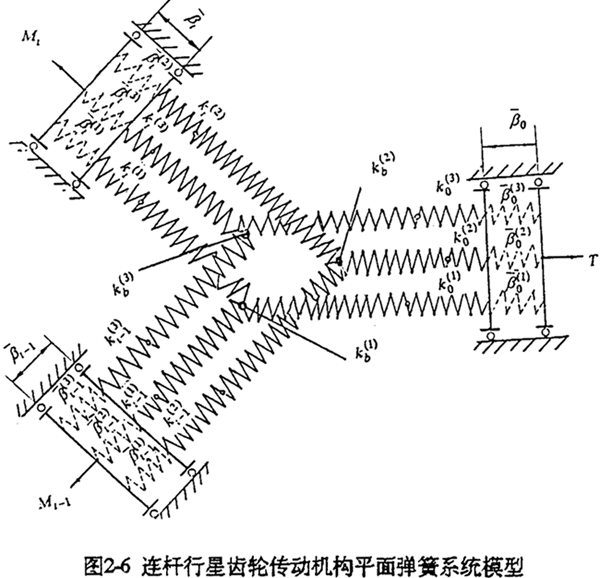國科2-3所示為一多相并列連桿行星齒輪過約束機(jī)構(gòu)。為了得到與靜不定次數(shù)相對應(yīng)的S個(gè)補(bǔ)充方程,必考慮各構(gòu)件間、各相機(jī)構(gòu)間、以及多齒承載的位移協(xié)調(diào)要求,這是分析具有多余聯(lián)系體系受力的一般方法。為此,可先將機(jī)構(gòu)轉(zhuǎn)化為受力、變形等效的結(jié)構(gòu)(幾何不變體系),然后用結(jié)構(gòu)力學(xué)的方法分析系統(tǒng)、構(gòu)件位移協(xié)調(diào)的條件。