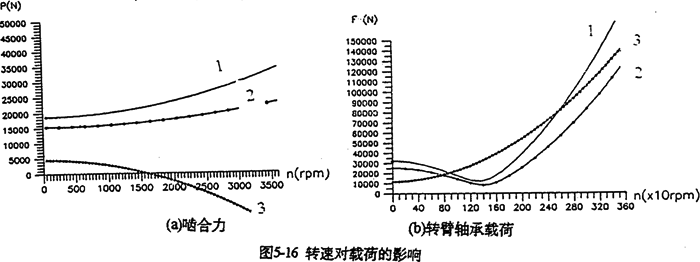 輸入扭矩對減速器的靜態(tài)載荷產(chǎn)生影響,而轉(zhuǎn)速是對動態(tài)載荷產(chǎn)生影響。圖5-16是輸入轉(zhuǎn)速對減速器的載荷影響情況。轉(zhuǎn)速越大,三相嚙合力越不均衡,當(dāng)轉(zhuǎn)速超過1500rpm后,第三相齒板與外齒輪的嚙合力變成負(fù)值。負(fù)向嚙合力將阻礙輸出軸的轉(zhuǎn)動,使內(nèi)嚙合副產(chǎn)生干涉。第一片齒板的嚙合力最大,幅值隨轉(zhuǎn)速的增加而增加。從行星軸承載荷看,轉(zhuǎn)速小于1600rpm時載荷較均衡,大于1600rpm后,隨轉(zhuǎn)速加大,其幅值變大。