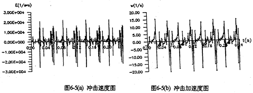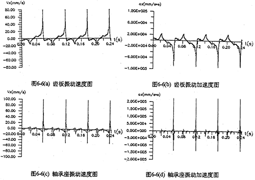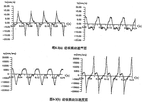 圖6-7是某相雙曲柄機構在輸入端具有0.03mm間隙時,齒板及軸承座的振動速度、振動加速度。圖中表明,速度、加速度都在兩個死點位置出現(xiàn)較大的沖擊值。