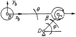 上式中,(xb,yb)是B處的位移量,θ為連桿繞鉸點的轉角位移,β為接觸點C在從動曲柄軸上繞軸線(D)的轉角位移,L為連桿的長度,見圖3.2。