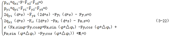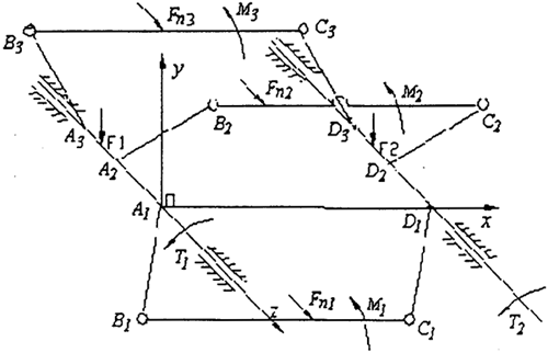 共可列出10個方程,聯(lián)立式(3-10)或(3-11),對于多相并列雙曲柄結構,用一般靜態(tài)力學分析方法,可列出3n+10個方程,而未知量的總數(shù)為4n+9(運動副反力和輸入力矩),故機構中未知量,(n-1)正是機構中的虛約束個數(shù),為了得到補充方程,必須考慮構件的變形協(xié)調要求。