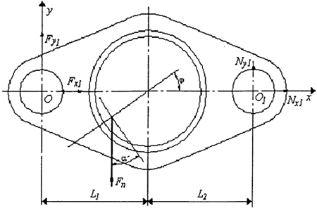 把一個三相并列雙曲柄機構作為一般情況進行受力分析,建立相應的數(shù)學模型,然后分四種狀況進行計算。圖3.4是基本型(低速軸在中間,高速軸兩側布置)環(huán)板受力情況,左邊的高速軸為輸入軸,輸入力知M,輸入轉速為n,中間帶外擺線輪的為輸出軸,右邊的高速軸為中間軸(支撐軸),在齒板上以左邊軸承孔中心B1為坐標原點建立坐標系0-XYZ,輸入曲軸A1B1與X軸的夾角為φ。
